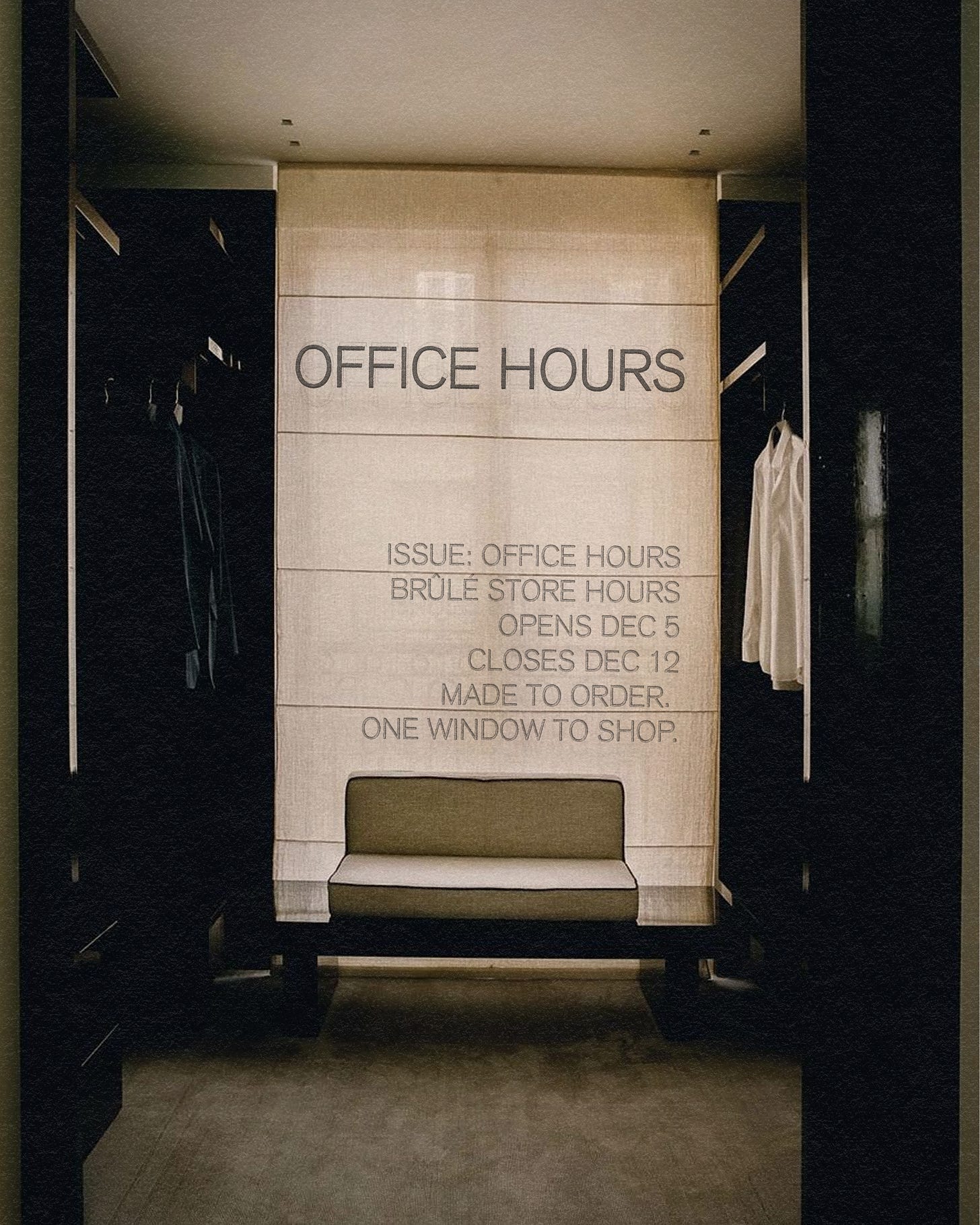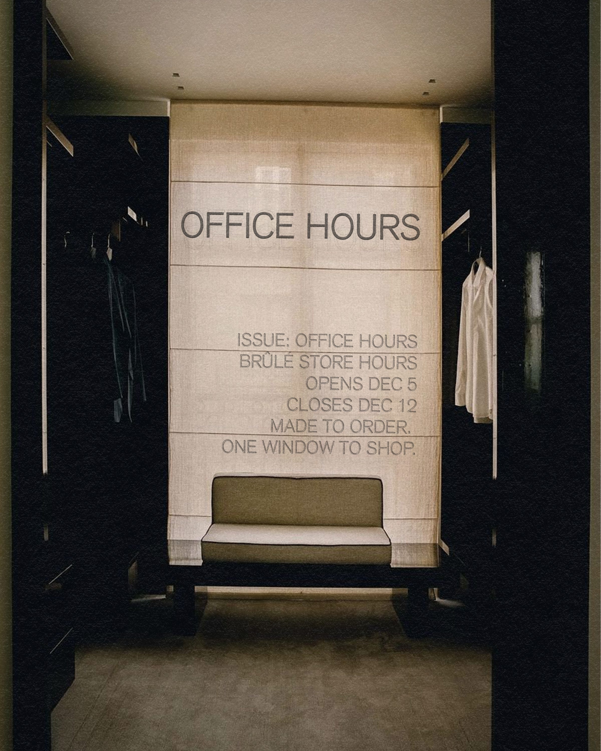 Issue: OFFICE HOURS. Dec 5th - Dec 12th. Made to order. One window to shop. See you tomorrow.